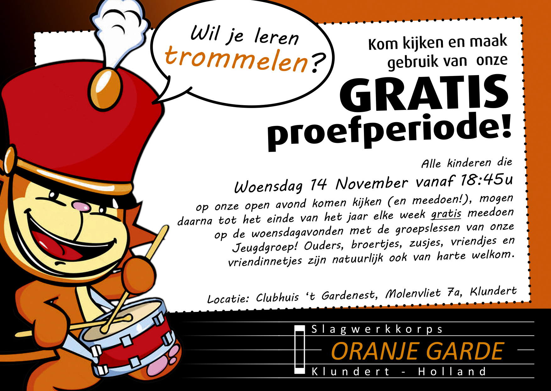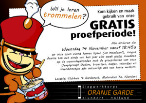 Slagwerkkorps Oranje Garde uit Klundert gaat binnenkort weer van start met slagwerklessen voor kinderen die actief muziek willen maken. Om te laten zien wat Oranje Garde doet en hoe dit gaat is er op woensdagavond 14 november een open avond in het clubgebouw aan de Molenvliet 7a (achter de sporthal).